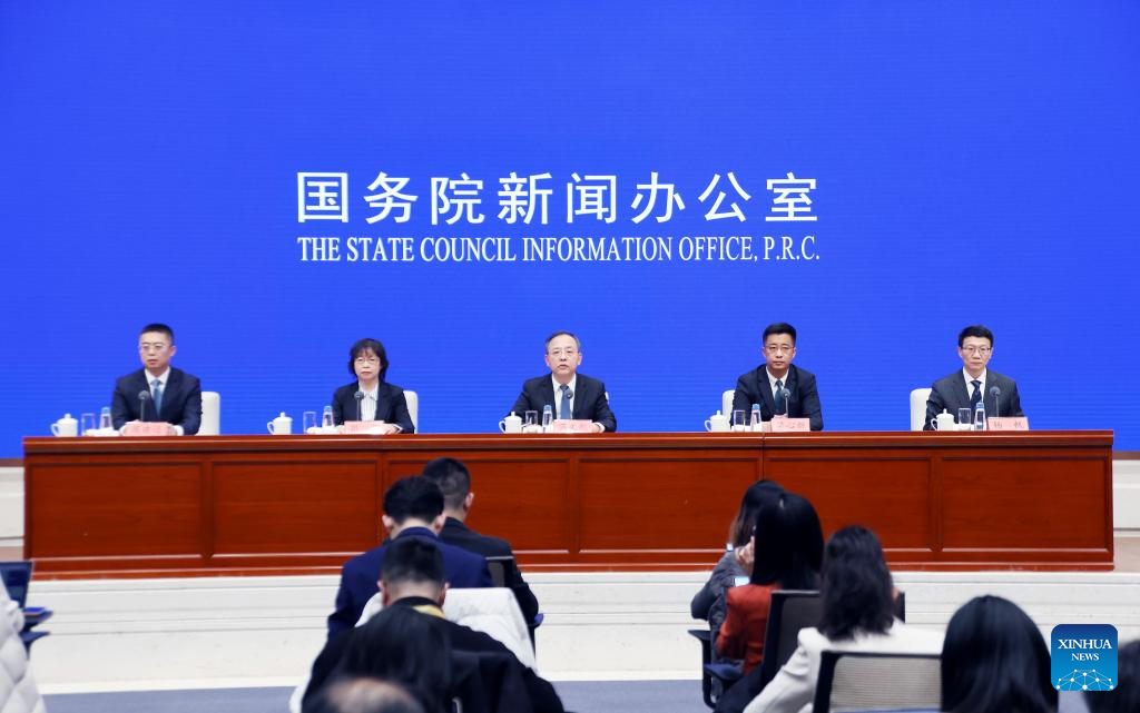 Rui Wenbiao (C), deputy commissioner of the China National Intellectual Property Administration, Liang Xinxin (2nd R), director general of the Strategic Planning Department of the China National Intellectual Property Administration, Guo Wen (2nd L), director general of the Intellectual Property Protection Department of the China National Intellectual Property Administration and Yang Fan (1st R), director general of the Public Service Department of the China National Intellectual Property Administration, attend a press conference held by the State Council Information Office (SCIO) on intellectual property development in 2025, in Beijing, capital of China, Jan. 23, 2026. (Xinhua/Pan Xu)