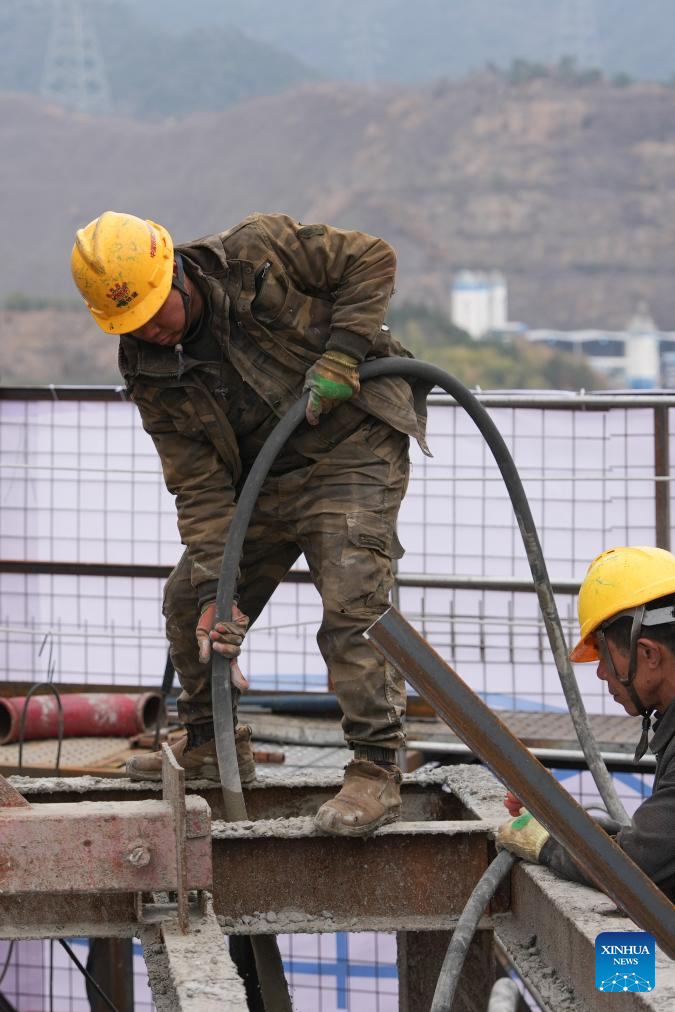 This photo taken on Jan. 25, 2026 shows constructors working at the concrete pouring site of the crossbeam on the east main tower of the Fuchimen road-rail bridge on the Ningbo-Zhoushan Railway in Zhoushan, east China's Zhejiang Province. The concrete pouring operation for the crossbeam on the east main tower of the Fuchimen road-rail bridge was completed successfully on Sunday, marking a breakthrough in the main tower's primary structure construction and laying a foundation for the subsequent construction of the entire bridge deck system.
