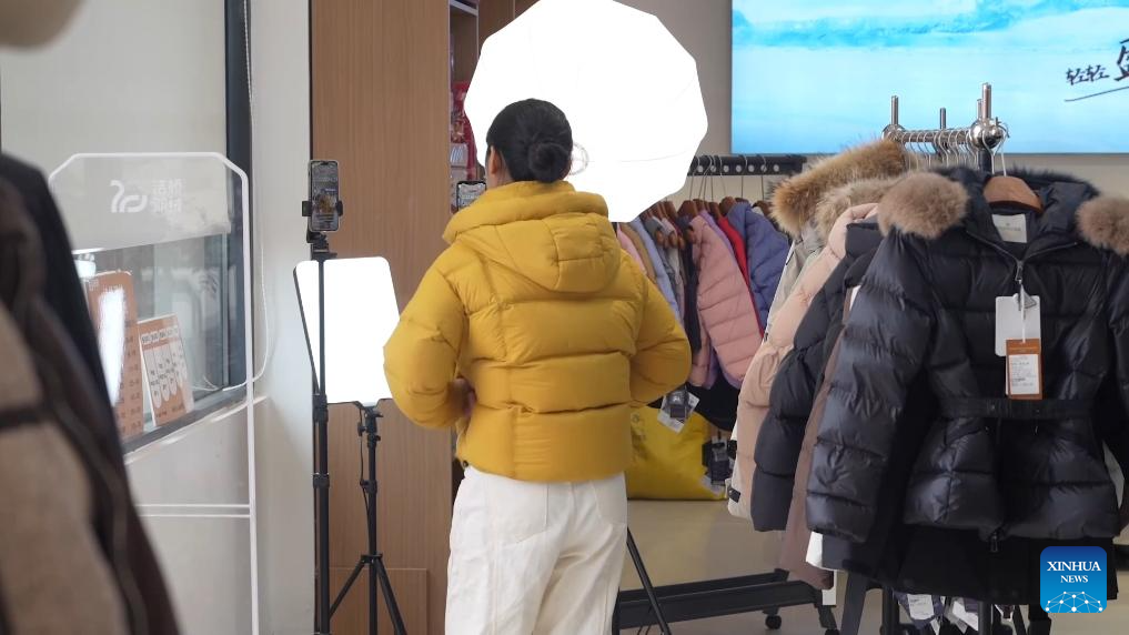 A staff member promotes down jackets via livestreaming at a store in Guigang City, south China's Guangxi Zhuang Autonomous Region, Jan. 4, 2026.(Xinhua/Qin Guanghua)