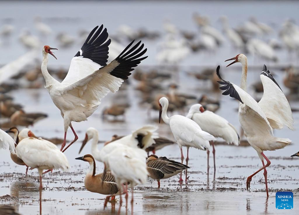 White cranes and other migratory birds are pictured at a wetland reserve in Yugan County of Shangrao, east China's Jiangxi Province, Feb. 27, 2026. (Xinhua/Wan Xiang)