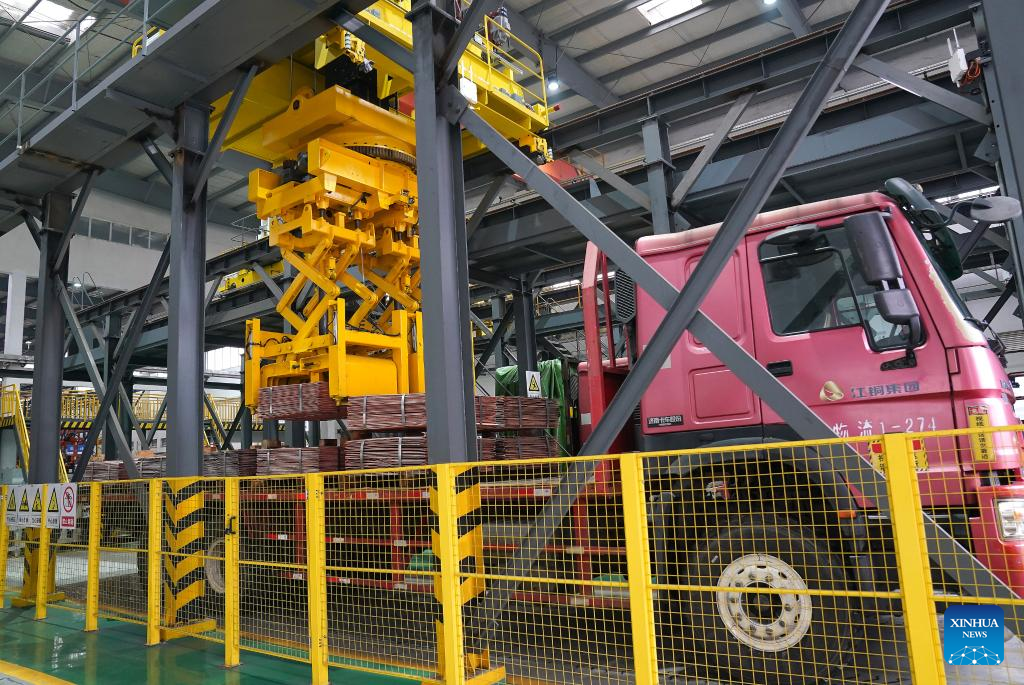 Finished copper plates are automatically loaded onto a truck at a smart electrolysis workshop of Guixi Smelter in Yingtan City, east China's Jiangxi Province, on Jan. 21, 2026.