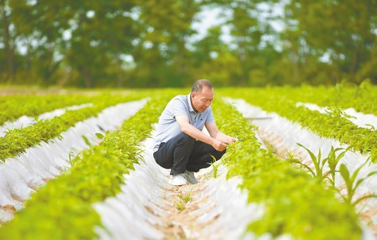 Qin Yanjun, head of a sweet potato cooperative in Heyang county, Weinan city, Shaanxi province, inspects recently planted virus-resistant sweet potato seedlings at a local demonstration field. (Photo by Niu Gang / Shaanxi Daily)