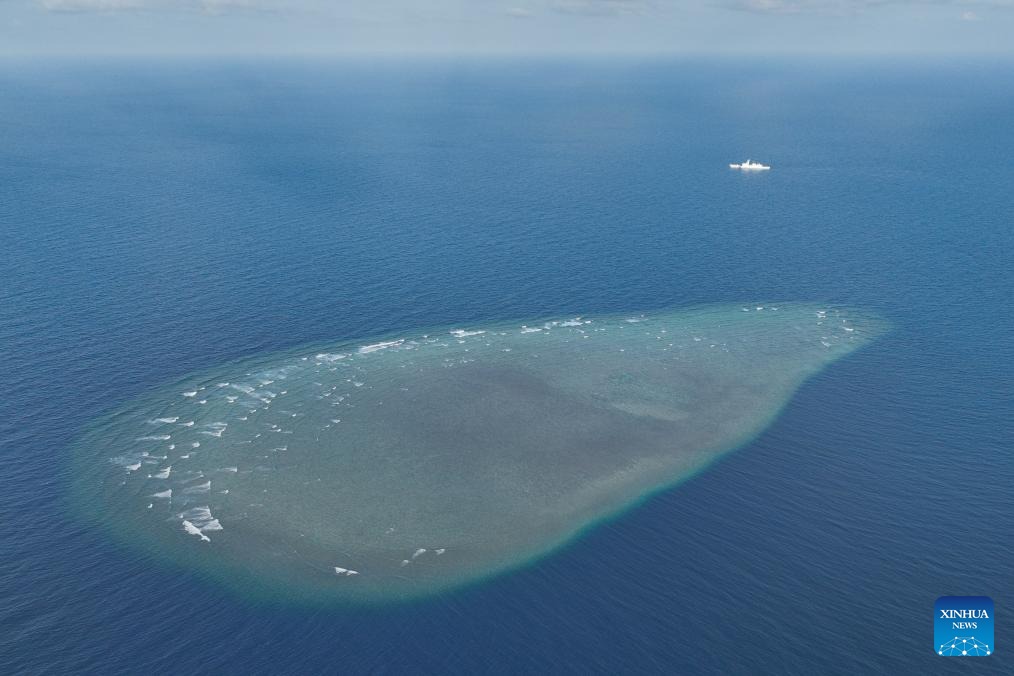 An aerial drone photo taken on March 22, 2026 shows a reef in the South China Sea.