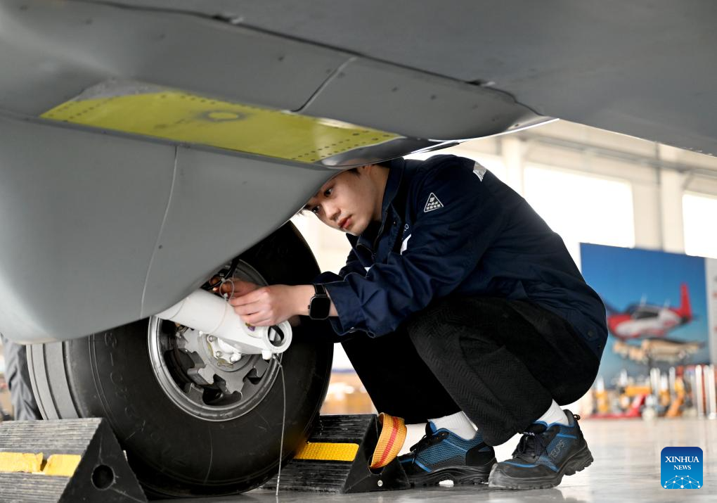 A staff member checks the tires of the Changying-8 cargo unmanned aerial vehicle (UAV) before a test flight at an airport in Zhengzhou, central China's Henan Province, March 30, 2026. The cargo UAV successfully completed its maiden flight at an airport in Zhengzhou on Tuesday.