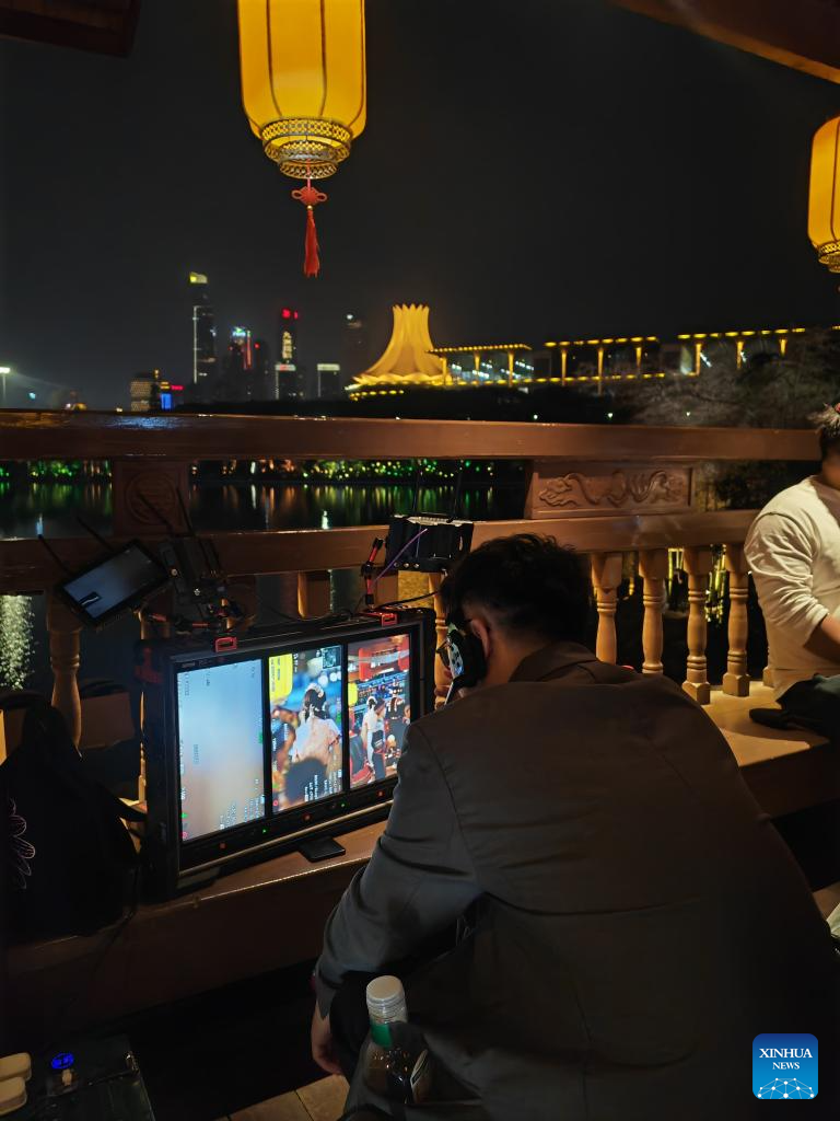 This photo taken with a mobile phone shows a scene at the shooting site of a mini-drama at Min'ge Lake scenic area in Nanning, south China's Guangxi Zhuang Autonomous Region, March 8, 2026. (Xinhua/Chen Luyuan)
